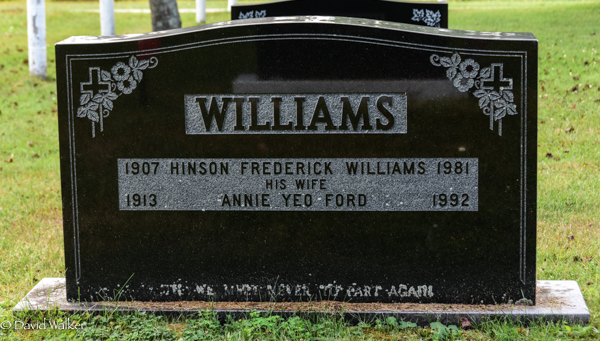 Inscription: WILLIAMS / 1907 Hinson Frederick Williams 1981 / His Wife / 1913 Annie Yeo Ford 1992.1,2  Tombstone, Hinson Frederick Willaims (1907-1981), his wife Annie Yeo Ford (1913-1992). St. John's Anglican Church Cemetery, Ellerslie, Prince County, Prince Edward Island, Canada.
