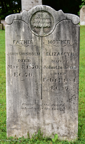 Inscription: Father / John Chisholm / Died / Mar. 3, 1870, / Æt. 76. | Mother / Elizabeth / Wife of / John Chisholm / Died / Feb. 14, 1884, / Æt. 86. / Blessed are the dead / who die in the Lord.2,3  Tombstone, John Chisholm (c1794-1870), his wife Elizabeth (c1798-1884). United Church Cemetery, Freetown, Prince County, Prince Edward Island, Canada.