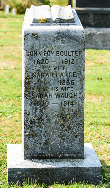 Inscription: John Foy Boulter / 1820 - 1912 / His Wife / Sarah Large / - 1866 / Also His Wife / Sarah Waugh / 1830 - 1914.1,2  Tombstone, John Foy Boulter (1820-1912), his first wife Sarah Large (?-1866), his second wife Sarah Waugh (1830-1914). Presbyterian/United Cemetery, Tryon, Prince County, Prince Edward Island, Canada.