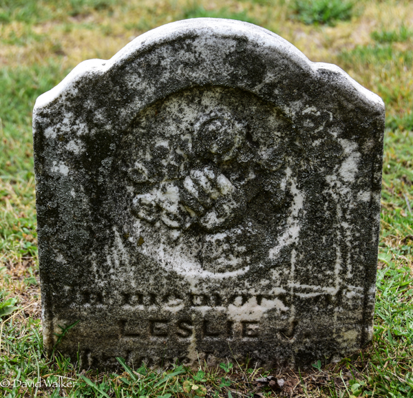 Inscription: In Memory of / Leslie J. / Beloved son of / [rest is below ground].1,2  Tombstone, Leslie J. Waugh ( -1830). Peoples Cemetery, Summerside, Prince County, Prince Edward Island, Canada.