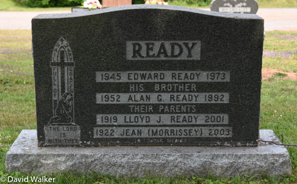 Inscription: READY / 1945 Edward Ready 1973 / His Brother / 1952 Alan G. Ready 1992 / Their Parents / 1919 Lloyd J. Ready 2001 / 1922 Jean (Morrissey) 2003.2,1  Tombstone, Lloyd J. Wells (1919-2001), his wife Jean Morrissey (1922-2003), their sons Edward Ready (1945-1973) and Alan G. Ready (1952-1992). St. Simon & St. Jude Roman Catholic Church Cemetery, Tignish, Prince County, Prince Edward Island, Canada.
