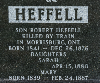 Inscription: HEFFELL / William Heffell / Born 1798 - Jan. 4, 1878 / His Wife / Rachel Waugh / Born 1800 - Apr. 15, 1879Back: HEFFELL / Son Robert Heffell / Killed by Train / in Morrisburg, ONT. / Born 1841 - Dec. 26, 1876 / Daughters / Sarah / - Apr. 15, 1880 / Mary / Born 1839 - Feb. 24, 1887.1,3  Cemetery Marker: William Heffell (c1798-1878), his wife Rachel Waugh (1800-1879), their children Robert (1841-1876), Sarah (?-1880) and Mary (1839-1887). Presbyterian/United Cemetery, North Bedeque, Prince County, Prince Edward Island, Canada.  Back inscription detail.