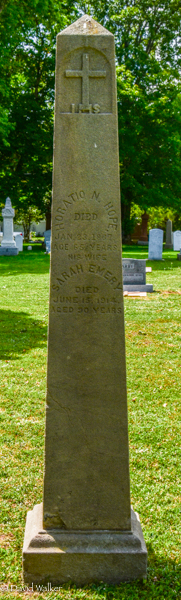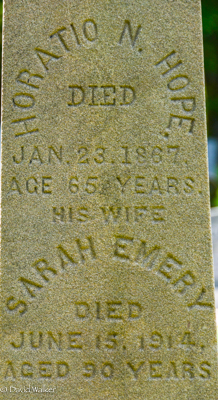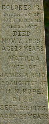 Inscription: Horatio N. Hope / Died / Jan. 23, 1867. / His Wife / Sarah Emery / Died / June 15, 1914 / Aged 90 yearsLeft:Sue G. Hope / Wife of . H.H. Muttart / Dau. of / H.N. & S.E. Hope / Born / Feb. 22, 1858. / Died / June 27, 1888. / Rest and SleepRight:Dolores C. / Daughter of / Horatio N. & Ma- / tilda Hope / Died / Nov. 7, 1865. / Age 19 years. / Matilda / Wife of / James A. Reid / & Daughter of / H.N. Hope / Died / Sept. 29, 1875. / Aged 26 years.2,3  Tombstone, Horatio Nelson Hope (1782-1867), his wife Sarah Emery (1824-1914), their daughter Susan Goodwin Hope (1858-1888), his daughters Dolores C. Hope (1845-1865) and Matilda Hope (1849-1875) by his first marriage to Matilda Ann Hooper. St. John's Anglican Cemetery, St. Eleanors , Prince County, Prince Edward Island, Canada.  Front inscription detail.  Left inscription detail.  Right inscription detail.