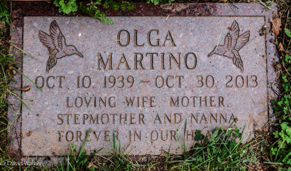 Inscription: Olga / Martino / Oct. 10, 1939 - Oct. 30, 2013 / Loving Wife, Mother / Stepmother and Nanna / Forever in Our Hearts.2  Tombstone, Olga (Hutchinson) Martino (1939-2013). United Church Cemetery, Bideford, Prince County, Prince Edward Island, Canada.