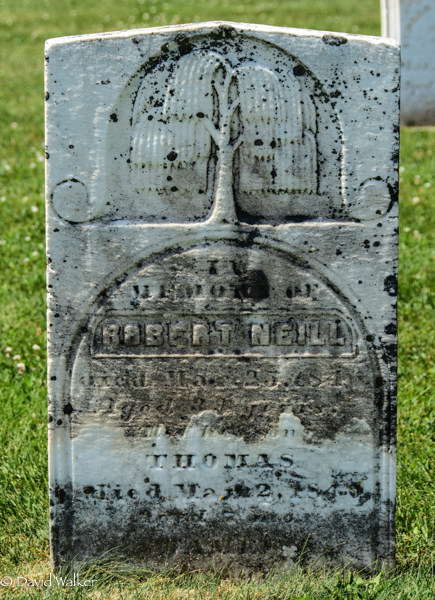 Inscription: In / Memory of / Robert Neill / died Mar. 25, 1846 / Aged 39 years / Also his sons / Thomas / died Mar. 2, 1840, Aged 7 mos. / James / died Jan. 1, 1856 [rest below ground].1,2  Tombstone, Robert Neill (1807-1846), his sons Thomas (1848-1849) and James (?-1856). Presbyterian/United Cemetery, North Bedeque, Prince County, Prince Edward Island, Canada.