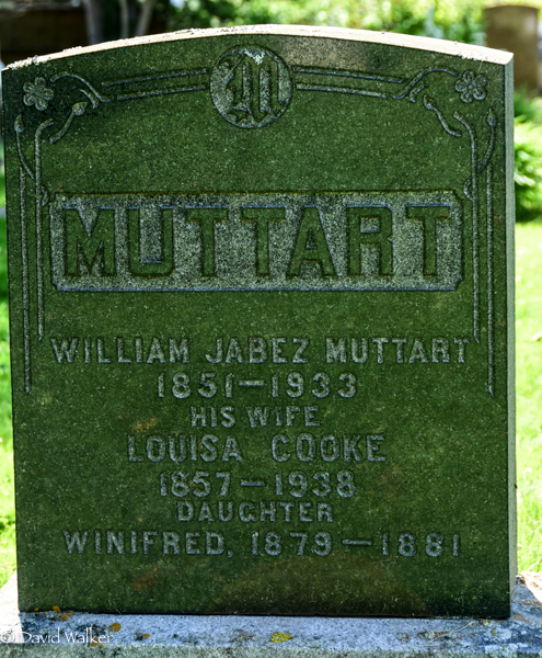Inscription: MUTTART / William Jabez Muttart / 1851 - 1933 / His Wife / Louisa Cooke / 1857 - 1938 / Daughter / Winifred 1879 - 1881Back: MUTTART / Jennie E. Smallwood / Wife of / W. W. Muttart / 1886 - 1932 / Willard W. Muttart / 1888 - 1950.4,7  Tombstone, William Jabez Muttart (1851-1933), his wife Louisa Cooke (1857-1938), their daughter Winifred (1879-1881), their son Willard W. Muttart (1888-1950), his wife Jennie E. Smallwood (1886-1932). Peoples Cemetery, Summerside, Prince County, Prince Edward Island, Canada.  Back inscription detail.