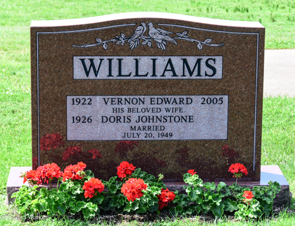 Inscription: WILLIAMS / 1922 Vernon Edward 2005 / His Beloved Wife / 1926 Doris Johnstone / Married / July 20, 1949.1,3  Tombstone, Vernon Edward Williams (1922-2005), his wife Doris Johnstone (1926- ). Geddie Memorial Cemetery, Springbrook, Queens County, Prince Edward Island, Canada.