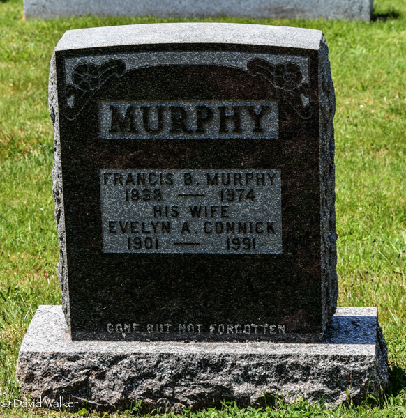 | Burial | He was buried in St. James Catholic Church Cemetery, Summerfield, Queens County, Prince Edward Island, Canada, 46.40133, -63.54759G. Inscription: MURPHY / Francis B. Murphy / 1898 - 1974 / His Wife / Evelyn A. Connick / 1901 - 1991 / Gone but not forgotten.2 ![]() Tombstone, Francis B. Murphy (1898-1974), his wife Evelyn A. Connick (1901-1991). St. James Roman Catholic Cemetery, Summerfield, Queens County, Prince Edward Island, Canada. |