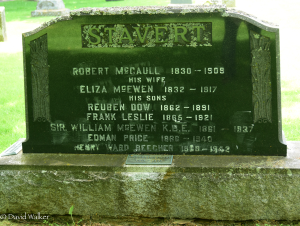 | Interred | He was buried in the plot of Robert McCaull Stavert, in the Peoples Cemetery, Summerside, Prince County, Prince Edward Island, Canada, 46.40520, -63.77640G. Inscription: STAVERT / Robert McCaull 1830 - 1909 / His Wife / Eliza McEwen 1832 - 1917 / His Sons / Reuben Dow 1862 - 1891 / Frank Leslie 1865 - 1921 / Sir William McEwen K.B.E. 1861 - 1937 / Edman Price 1866 - 1940 / Henry Ward Beecher 1868 - 1942 /Plate on base: Lady Alma Kate Stavert / 1864 - 1959Left (plate on base): Florence Ann Stavert / Apr. 19, 1876 - July 27, 1972 / Wife of / Henry Ward Beecher Stavert.2,1 ![]() Tombstone, Robert McCaull Stavert (1830-1909), his wife Eliza McEwen (1832-1917), their sons Reuben Dow Stavert (1862-1891), Frank Leslie Stavert (1865-1921), Sir William McEwen Stavert K.B.E. (1861-1937), Edman Price Stavert (1866-1940), Henry Ward Beecher Stavert (1868-1942), Lady Alma Kate Stavert (1864-1959), wife of Sir William McEwen Stavert, Florence Ann Stavert ((1876-1972), wife of Henry Ward Beecher Stavert. Peoples Cemetery, Summerside, Prince County, Prince Edward Island, Canada. ![]() Front plate. ![]() Left plate. |
