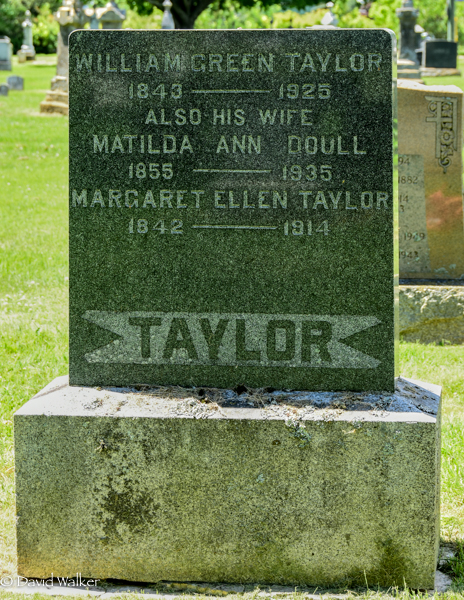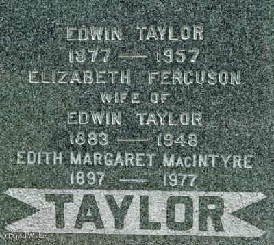 | Interred | She was buried in the plot of William Green Taylor, in the Peoples Cemetery, Summerside, Prince County, Prince Edward Island, Canada, 46.40537, -63.77634G. Inscription: William Green Taylor / 1843 - 1925 / Also His Wife / Matilda Ann Doull / 1855 - 1935 / Margaret Ellen Taylor / 1842 - 1914 / TAYLORBack: Edwin Taylor / 1877 - 1957 / Elizabeth Ferguson / Wife of / Edwin Taylor / 1883 - 1948 / Edith Margaret MacIntyre.1 ![]() Tombstone, William Green Taylor (1844-1925), his wife Matilda Ann Doull (1855-1935), his sister Margaret Ellen Taylor (1842-1914), their son Edwin (1877-1957), his first wife Elizabeth Ferguson (1883-1948), his second wife Edith Margaret MacIntyre (1897-1977). Peoples Cemetery, Summerside, Prince County, Prince Edward Island, Canada. ![]() Back inscription detail. |