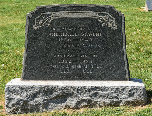 | Interred | He was buried in the plot of Thomas Stavert, in Presbyterian/United Church Cemetery, North Bedeque, Prince County, Prince Edward Island, Canada, 46.36153, -63.72590G.