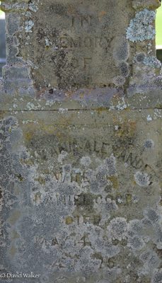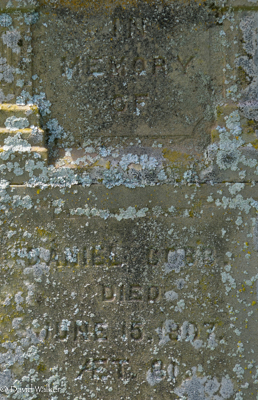 Inscription: In / Memory of / Annie Donald / Wife of / William P. Woodside / Born / Aug. 4, 1845, / Died June 6, 1901.Left: In / Memory of / Elizabeth A. Taylor / Wife of / Wm. P. Woodside / Died / Sept. 23, 1927, / Aged 65 yrs.Right: In / Memory of / Wm. P. Woodside / Died / Mar. 4, 1930, / Aged 86 yr's / Also His Son / Melford S. / Died / April 9, 1953, / Aged 73 yrs.2,1  Cemetery marker, William Pickering Woodside (1844-1930), his first wife Annie Donald (1845-1901), his second wife Elizabeth A. Taylor (1862-1927), Melford S. Woodside (1879-1953), son of William and Annie. Peoples Cemetery, Malpeque, Prince County, Prince Edward Island, Canada.  Front inscription detail.  Left inscription detail.  Right inscription detail.