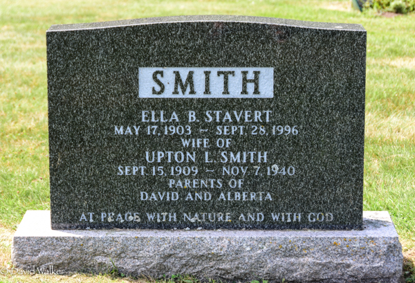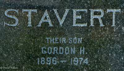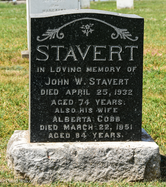 Inscription: STAVERT / In Loving Memory of / John W. Stavert / Died April 25, 1932 / Aged 74 Years. / Also His Wife / Alberta Cobb / Died March 22, 1951 / Aged 84 Years.Back: STAVERT / Their Son / Gordon H. / 1896 - 1974.5,1  Tombstone, John W. Stavert (1858-1932), his wife Alberta Cobb (1867-1951). Presbyterian/United Cemetery, North Bedeque, Prince County, Prince Edward Island, Canada.  Back inscription.