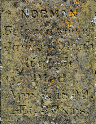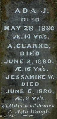 Inscription: James Waugh / Died / Mar. 21, 1906, / Æt. 80 yrs. / Adah Ann / His Wife / Died / Dec. 23, 1905, / Æt. 72 yrs.Left: Norman / Beloved son of / James & Adah / Waugh / Died / Apr. 9, 1899, / Æt. 30 yrs.Back: Ada J. / Died / May 28, 1880 / Æ. 14 yr's. / A. Clarke / Died / June 2, 1880, / Æ. 16 yr's / Jessamine W. / Died / June 6, 1880 / Æ. 6 yr's / Children of James / & Ada Waugh.2,1  Tombstone, James Waugh (1826-1906), his wife Adah Ann Clark (1833-1905), their children Norman (1869-1899), Ada (1866-1880), Clarke (1864-1880) and Jessamine (1874-1880) . United Baptist Cemetery, Central Bedeque, Prince County, Prince Edward Island, Canada.  Front inscription detail.  Left inscription detail.  Back inscription.