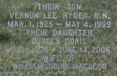 Inscription: RYDER / Margaret Greta Gray / Wife of / Nelson William Ryder / Oct. 27, 1903 - Jan. 12, 1980 / their son / Ralph Charles / Sept. 11, 1942Back: Their Son / Vernon Lee Ryder, R.N. / Mar. 1, 1925 - May 4, 1999 / Their Daughter / Doreen Doris / Aug. 1, 1934 - June 14, 2006 / Wife of / William John MacLeod.1  Tombstone, Margaret Greta Gray (1903-1980), her children Ralph Charles Ryder (1942- ), Vernon Lee Ryder (1925-1999) and Doreen Doris Ryder (1934-2006). Hillside Cemetery, Wellington, Prince County, Prince Edward Island, Canada.  Back inscription detail.