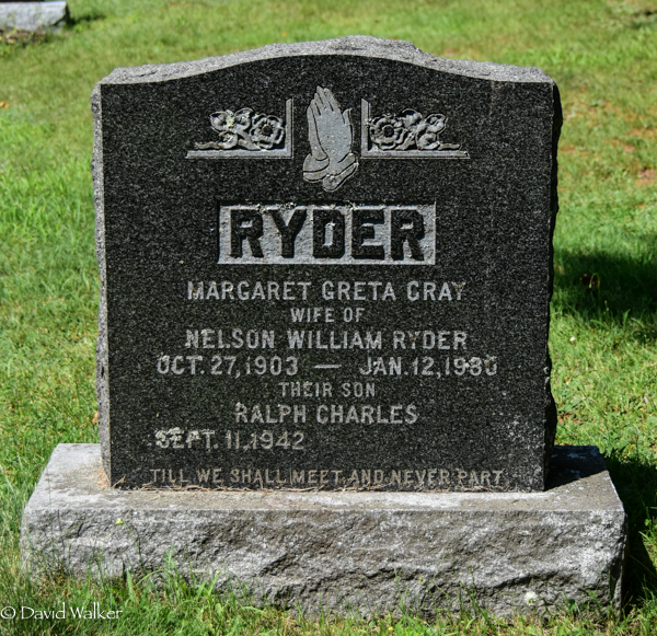 - [S12495] Cemetery marker, United Church Cemetery, Union Corner, Prince County, Prince Edward Island, Canada. Margaret Greta (Gray) Ryder, tombstone inscription & photograph; read by David A. Walker, 13 August 2018.