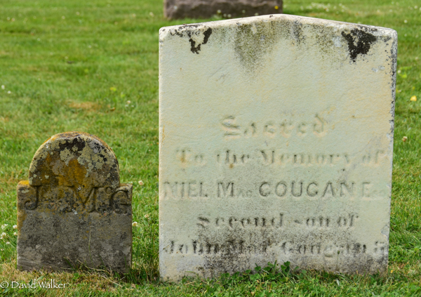 Inscription: Sacred / to the memory of / Niel MacGougane / Second son of / John & Mary MacGougan / (rest below ground.)1  Tombstone, Neil McGougan (ca. 1787- ? ). The small stone to the left is likely his father, John. Peoples Cemetery, Malpeque, Prince County, Prince Edward Island, Canada.