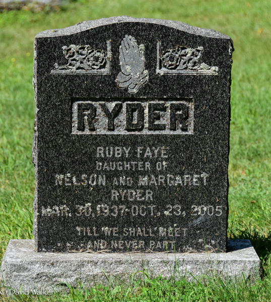 Inscription: RYDER / Ruby Faye / Daughter of / Nelson and Margaret / Ryder / Mar. 30, 1937 - Oct. 23, 2005 / Till we shall meet . and never part.1  Tombstone, Ruby Faye Ryder (1937-2005). Hillside Cemetery, Wellington, Prince County, Prince Edward Island, Canada.