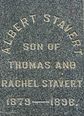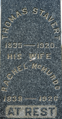 Inscription: Thomas Stavert / 1835 - 1920 / His Wife / Rachel McMurdo / 1838 - 1926 / At rest / STAVERTLeft: Albert Stavert / Son of / Thomas and / Rachel Stavert / 1879 - 1898.2,1  Tombstone,Thomas Stavert (1835-1920), his wife Rachel MacMurdo (1838-1926), their son Albert (1879-1898). Peoples Cemetery, Malpeque, Prince County, Prince Edward Island, Canada.  Front inscription.  Left inscription.