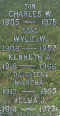 Inscription: CREWE / John K. Crewe / 1874 - 1946 / His Wife / Laura Arnett / 1884 - 1971 / Son / Frank J. 1910 - 1978 / He Giveth His Beloved SleepBack: Son / Charles W. / 1905 - 1976 / Sons / Wylie / 1908 - 1962 / Kenneth A. / 1918 - 1966 / Daughters / Martha / 1913 - 1993 / Velma J. (1914 - 1977). (Charles is actually buried in Evergreen Cemetery, Hopkinton, Massachusetts. The inscription here would be a memorial.)10,2  Tombstone, John K. Crewe (1874-1946), his wife Laura Arnett (1884-1971), their sons Frank J. Crewe (1910-1978), Charles W. Crewe (1905-1976), Wylie W. Crewe (1908-1962), Kenneth A. Crewe (1918-1966), daughters Martha Crewe (1913-1993) and Velma J. Crewe (1914-1977). United Church Cemetery, Searletown, Prince County, Prince Edward Island, Canada.  Back inscription detail.