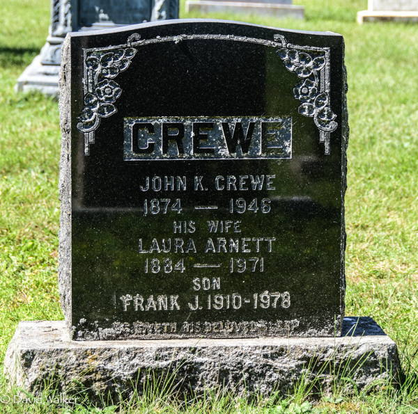 Inscription: CREWE / John K. Crewe / 1874 - 1946 / His Wife / Laura Arnett / 1884 - 1971 / Son / Frank J. 1910 - 1978 / He Giveth His Beloved SleepBack: Son / Charles W. / 1905 - 1976 / Sons / Wylie / 1908 - 1962 / Kenneth A. / 1918 - 1966 / Daughters / Martha / 1913 - 1993 / Velma J. (1914 - 1977). (Charles is actually buried in Evergreen Cemetery, Hopkinton, Massachusetts. The inscription here would be a memorial.)13,2  Tombstone, John K. Crewe (1874-1946), his wife Laura Arnett (1884-1971), their sons Frank J. Crewe (1910-1978), Charles W. Crewe (1905-1976), Wylie W. Crewe (1908-1962), Kenneth A. Crewe (1918-1966), daughters Martha Crewe (1913-1993) and Velma J. Crewe (1914-1977). United Church Cemetery, Searletown, Prince County, Prince Edward Island, Canada.  Back inscription detail.