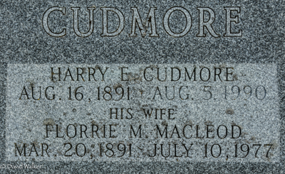 Inscription: CUDMORE / John T. Cudmore / Died Dec. 23, 1922, Age 72 / His Wife / Bessie Martin / Died Mar. 4, 1922 Age 68Back: CUDMORE / Harry E. Cudmore / Aug. 16, 1891 - Aug. 5, 1990 / His Wife / Florrie M. Macleod / Mar. 20, 1891 - July 10, 1977.1  Tombstone, John T. Cudmore (c1850-1922), his wife Bessie Martin (c1854-1922), their son Harry E. Cudmore (1891-1990), his wife Florrie M. MacLeod (1891-1977). Peoples Cemetery, Crapaud, Queens County, Prince Edward Island, Canada.  Back inscription detail.