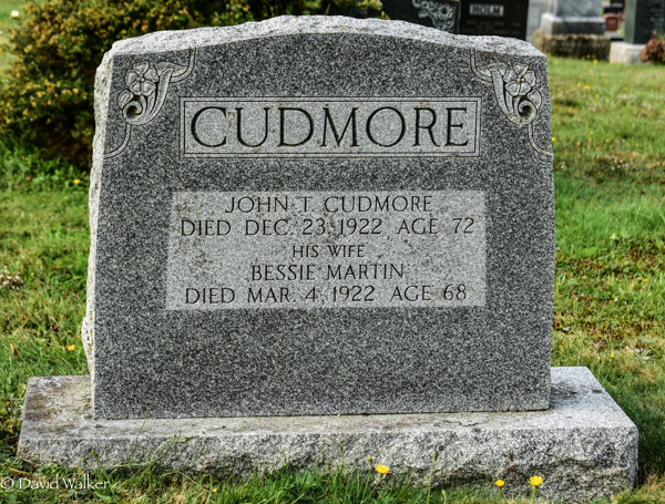 - [S12640] Cemetery Marker, Peoples Cemetery, Crapaud, Queens County, Prince Edward Island, Canada. John T. Cudmore family plot, photograph & inscription; read by David A. Walker, 15 September 2017.