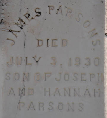 | Interred | James Parsons was buried in the plot of Joseph Parsons, in the United Church Cemetery, Margate, Prince County, Prince Edward Island, Canada, 46.45915, -63.58931G.