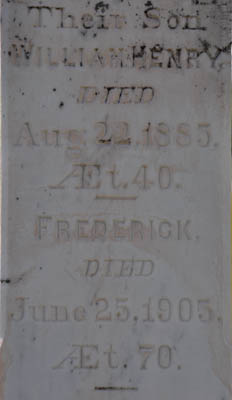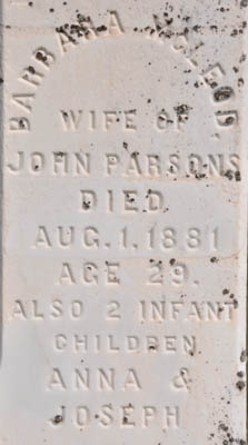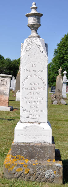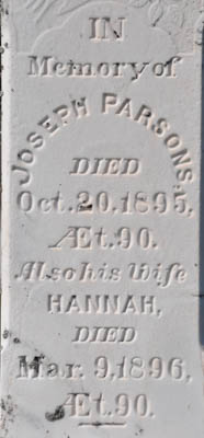 Inscription: In / Memory of / Joseph Parsons / Died / Oct. 20, 1895, / Æt. 90. / Also his Wife / Hannah, / Died / Mar. 9, 1896, / Æt. 90.Left: Barbara McLeod / Wife of / John Parsons / Died / Aug. 1, 1881 / Age 29. / Also 2 Infant / Children / Anna & / JosephRight: Their Son / William Henry, / Died / Aug. 22, 1885, / Æt. 40. / - / Frederick / Died / June 25, 1905, / Æt. 70.Back: James Parsons / Died / July 3, 1930 / Son of Joseph / and Hannah / Parsons.1  Tombstone, Joseph Parsons (1805-1890), his wife Hannah (1806-1896), their daughter-in-law, Barbara McLeod (1852-1881), wife of their son John Parsons, their two infant children, Anna and Joseph (no dates), their other sons, William Henry (1845-1885), Frederick (1835-1905) and James (1845-1930). United Church Cemetery, Margate, Prince County, Prince Edward Island, Canada.  Front inscription.  Left inscription.  Right inscription.  Back inscription.