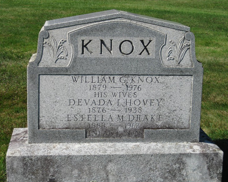 Inscription: KNOX / William G. Knox / 1879 - 1976 / His Wives / Devada L. Hovey / 1876 - 1938 / Estella M. Drake / 1883 - 1962 / Infant Son.1  Tombstone, William G. Knox (1879-1976), his wives, Devada L. Hovey (1876-1938) and Estella M. (Wallace) Drake (1876-1937). Evergreen Cemetery, Houlton, Maine, U.S.A.. Photo courtesy of Duke Thatcher.