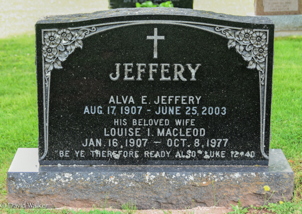 Inscription: JEFFERY / Alva E. Jeffery / Aug. 17, 1907 - June 25, 2003 / His Beloved Wife / Louise I. MacLeod / Jan. 16, 1907 - Oct. 8, 1977.2,3  Cemetery marker, Alva E. Jeffery (1907-2003), his wife Louise I. MacLeod (1907-1977). Peoples Cemetery, Summerside, Prince County, Prince Edward Island, Canada.