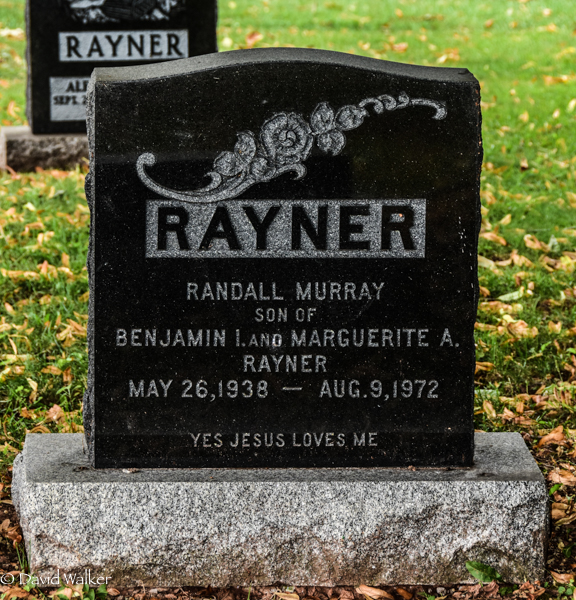 Inscription: RAYNER / Randall Murray / Son of / Benjamin I. and Marguerite A. / Rayner / May 26, 1938 - Aug. 9, 1972.1,2  Tombstone, Randall Murray Rayner (1938-1972). Peoples Cemetery, Summerside, Prince County, Prince Edward Island, Canada.