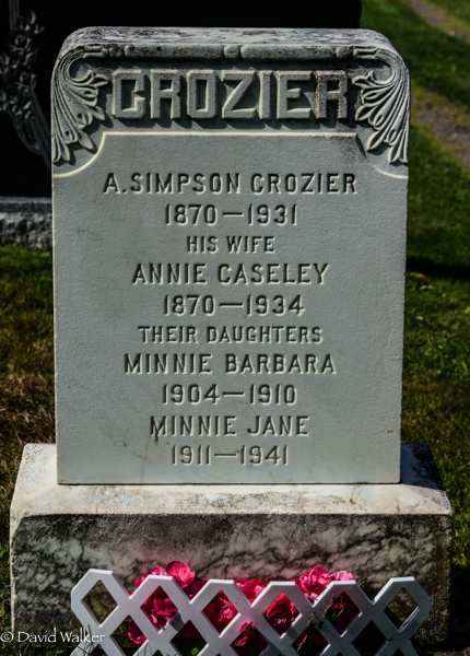 Inscription: CROZIER / A. Simpson Crozier / 1870 - 1931 / His Wife / Annie Caseley / 1870 - 1934 / Their Daughters / Minnie Barbara / 1904 - 1910 / Minnie Jane / 1911 - 1941.1,3  Tombstone, A. Simpson Crozier (1870-1931), his wife Annie Caseley (1870-1934), their daughters Minnie Barbara (1904-1910) and Minnie Jane (1911-1941). Peoples Cemetery, Malpeque, Prince County, Prince Edward Island, Canada.
