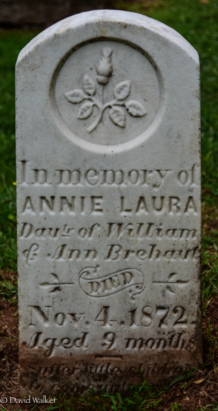 Inscription: In memory of / Annie Laura / Dautr. of William / & Ann Brehaut / Died / Nov. 4, 1872 / Aged 9 months / Suffer little children / to come unto me.1,2  Cemetery marker, Annie Laura Brehaut (1872-1872). Peoples Cemetery, Summerside, Prince County, Prince Edward Island, Canada.