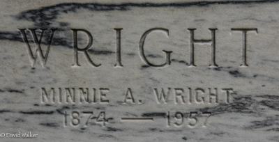 Inscription: WRIGHT / Frederick J. E. Wright / 1877 - 1947 / His Wife / Cora Davison / 1880 - 1972Back: WRIGHT / Minnie A. Wright / 1874 - 1957.2,3  Tombstone, Frederick J. E. Wright (1877-1947), his wife Cora Davison (1880-1972), his sister Minnie A. Wright (1874-1957). Peoples Cemetery, Summerside, Prince County, Prince Edward Island, Canada.  Back inscription detail.