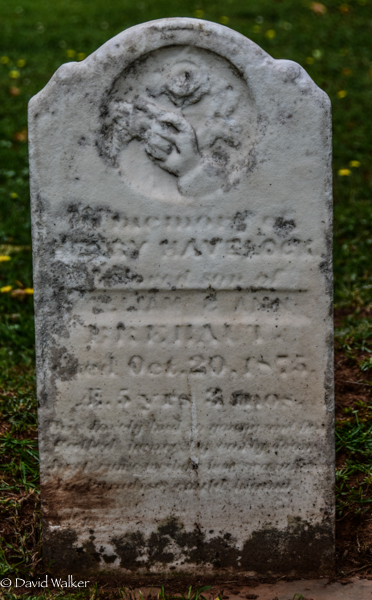 Inscription: In memory of / Henry Havelock / Beloved son of / William & Ann / Brehaut / Died Oct. 20, 1875, / Æ. 5 yrs 3 mos.1,2  Cemetery marker, Henry Havelock Brehaut (1870-1875). Peoples Cemetery, Summerside, Prince County, Prince Edward Island, Canada.