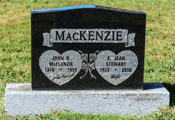 Inscription: MACKENZIE / John R. / MacKenzie / 1916 - 1996 / Husband| E. Jean / Stewart / 1922 - 2018 / Wife.1,2  Tombstone, John R. MacKenzie (1916-1996), his wife E. Jean Stewart (1922-2018). Peoples Cemetery, Malpeque, Prince County, Prince Edward Island, Canada.