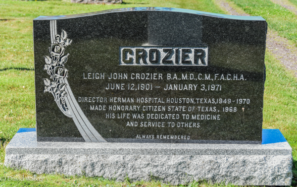 Inscription: CROZIER / Leigh John Crozier B.A., M.D., C.M., F.A.C.H.A. / June 12, 1901 - January 3, 1971 / Director Herman Hospital Houston, Texas, 1949 - 1970 / Made Honorary Citizen State of Texas, 1968 / His Life Was Dedicated to Medicine / And Service to Others / Always Remembered.1,3  Tombstone, Leigh John Crozier (1901-1971). Peoples Cemetery, Malpeque, Prince County, Prince Edward Island, Canada.