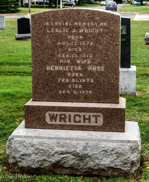Inscription: In Loving Memory of / Leslie A. Wright / Born / Aug. 12, 1870 / Died / Feb. 13, 1912 / His Wife / Henrietta Russ / Born / Feb. 21, 1875 / Died / Oct. 2, 1929. / WRIGHT.3,2  Tombstone, Leslie A. Wright (1869-1912), his wife Henrietta Russ (1875-1929). Peoples Cemetery, Summerside, Prince County, Prince Edward Island, Canada.