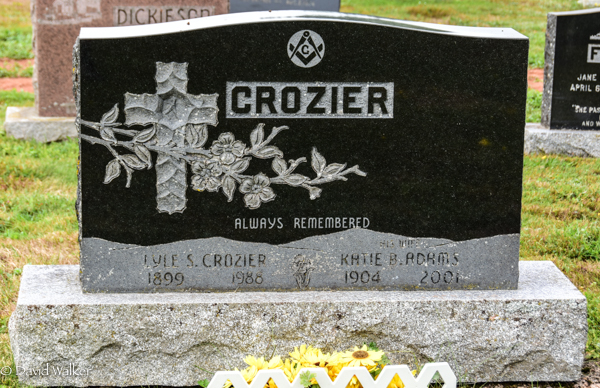 Inscription: CROZIER / Always Remembered / Lyle S. Crozier / 1899 - 1988 | His Wife / Katie B. Adams / 1904 - 2001.2,3  Tombstone, Lyle S. Crozier (1899-1988), his wife Katie B. Adams (1904-2001). Peoples Cemetery, Malpeque, Prince County, Prince Edward Island, Canada.