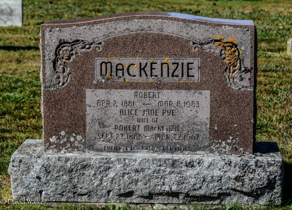 Inscription: MACKENZIE / Robert / Apr. 7, 1881 - Mar. 8, 1983 / Alice Jane Pye / Wife of / Robert MacKenzie / Sept. 23, 1887 - Mar. 23, 1967 / Ever Remembered - Ever Loved.1,2  Tombstone, Robert MacKenzie (1881-1983), his wife Alice Jane Pye (1887-1967). Peoples Cemetery, Malpeque, Prince County, Prince Edward Island, Canada.