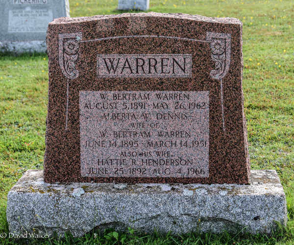 Inscription: WARREN / W. Bertram Warren / August 5, 1891 - May 26, 1962 / Alberta W. Dennis / Wife of / W. Bertram Warren / June 14, 1895 - March 14, 1951 / Also His Wife / Hattie R. Henderson / June 25, 1892 - Aug. 4, 1966.1,2  Cemetery Marker: W. Bertram Warren (1891-1962), his first wife Alberta Walkley Dinnis (1895-1951), his second wife Hattie R. Henderson (1892-1966). United Church Cemetery, Margate, Prince County, Prince Edward Island, Canada.