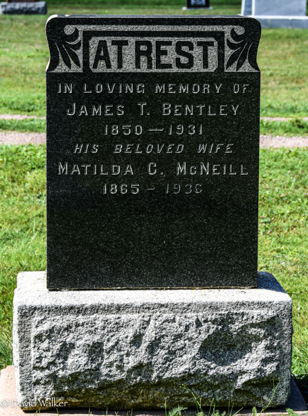 Inscription: AT REST / In Loving Memory of / James T. Bentley / 1850 - 1931 / His Beloved Wife / Matilda C. McNeill / 1865 - 1936Back: BENTLEY.3,2  Tombstone, James T. Bentley (1850-1931), his wife Matilda C. McNeill (1865-1936). Peoples Cemetery, Kensington, Prince County, Prince Edward Island, Canada.