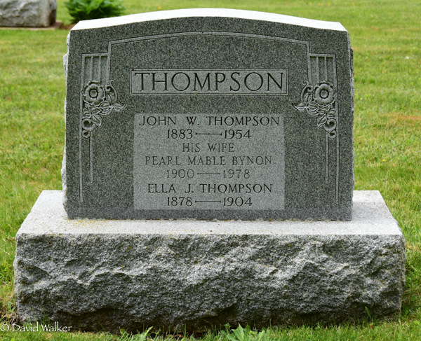 Inscription: THOMPSON / John W. Thompson / 1883 - 1954 / His Wife / Pearl Mable Bynon / 1900 - 1978 / Ella J. Thompson / 1878 - 1904.2,3  Tombstone, John W. Thompson (1883-1954), his wife Pearl Mable Bynon (1900-1978), his sister Ella J. Thompson (1878-1904). Peoples Cemetery, Kensington, Prince County, Prince Edward Island, Canada.