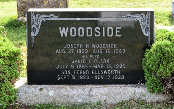 Inscription: WOODSIDE / Joseph H. Woodside / Aug. 27, 1899 - Aug. 16, 1983 / His Wife / Janie L. Clark / July 9, 1895 - Mar. 15, 1995 / Son, Ferno Ellsworth / Sept. 6, 1928 - Nov. 17, 1928.1  Cemetery Marker: Joseph H. Woodside (1899-1983), his wife Janie L. Clark (1895-1995), their son Ferno Ellsworth (1928-1928). United Church Cemetery, Margate, Prince County, Prince Edward Island, Canada.