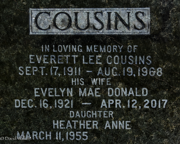 Inscription: COUSINS / William H. Cousins / 1870 - 1944 / His Wife / Florence M. Paynter / 1880 - 1963 / Peace Perfect PeaceBack: COUSINS / In Loving Memory of / Everett Lee Cousins / Sept. 17, 1911 - Aug. 19, 1968 / His Wife / Evelyn Mae Donald / Dec. 16, 1921 - Apr. 12, 2017 / Daughter / Heather Anne / March 11, 1955.1,3  Tombstone, William Hall Cousins (1870-1944), his wife Florence M. Paynter (1880-1963), their son Everett Lee Cousins (1911-1968), his wife Evelyn Mae Donald (1921-2017), their daughter Heather Anne (1955- ). Peoples Cemetery, Kensington, Prince County, Prince Edward Island, Canada.  Back inscription detail.