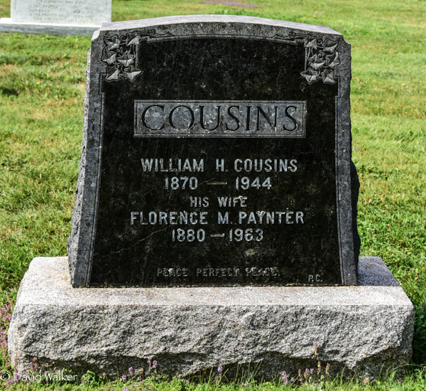 | Principal 2 | She witnessed the burial of William Hall Cousins and Florence M. Paynter in the Peoples Cemetery, Kensington, Prince County, Prince Edward Island, Canada, 46.44800, -63.62870G.1,2 Tombstone, William Hall Cousins (1870-1944), his wife Florence M. Paynter (1880-1963), their son Everett Lee Cousins (1911-1968), his wife Evelyn Mae Donald (1921-2017), their daughter Heather Anne (1955- ). Peoples Cemetery, Kensington, Prince County, Prince Edward Island, Canada.  Back inscription detail. |