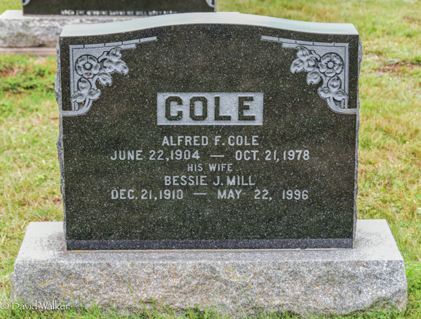 Inscription: COLE / Alfred F. Cole / June 22, 1904 - Oct. 21, 1978 / His Wife / Bessie J. Mill / Dec. 21, 1910 - May 22, 1996.1,2  Cemetery Marker: Alfred F. Cole (1904-1978), his wife Bessie J. Mill (1910-1996). St. Thomas Anglican Church Cemetery, Springbrook, Queens County, Prince Edward Island, Canada.