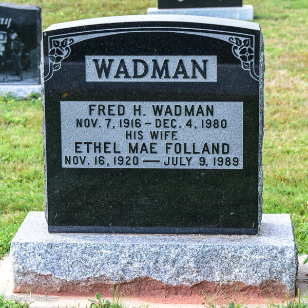 Inscription: WADMAN / Fred H. Wadman / Nov. 7, 1916 - Dec. 4, 1980 / His Wife / Ethel Mae Folland / Nov. 16, 1920 - July 9, 1989.1,3  Cemetery Marker: Fred H. Wadman (1916-1980), his wife Ethel Mae Folland (1920-1989). Peoples Cemetery, Kensington, Prince County, Prince Edward Island, Canada.