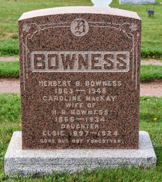 Inscription: BOWNESS / Herbert B. Bowness / 1863 - 1948 / Caroline MacKay / Wife of / H. B. Bowness / 1866 - 1934 / Daughter / Elsie 1897 - 1924 / Gone But Not Forgotten.1,2  Cemetery Marker: Herbert B. Bowness (1863-1948), his wife Caroline MacKay (1866-1934), their daughter Elsie (1897-1924). Peoples Cemetery, Kensington, Prince County, Prince Edward Island, Canada.
